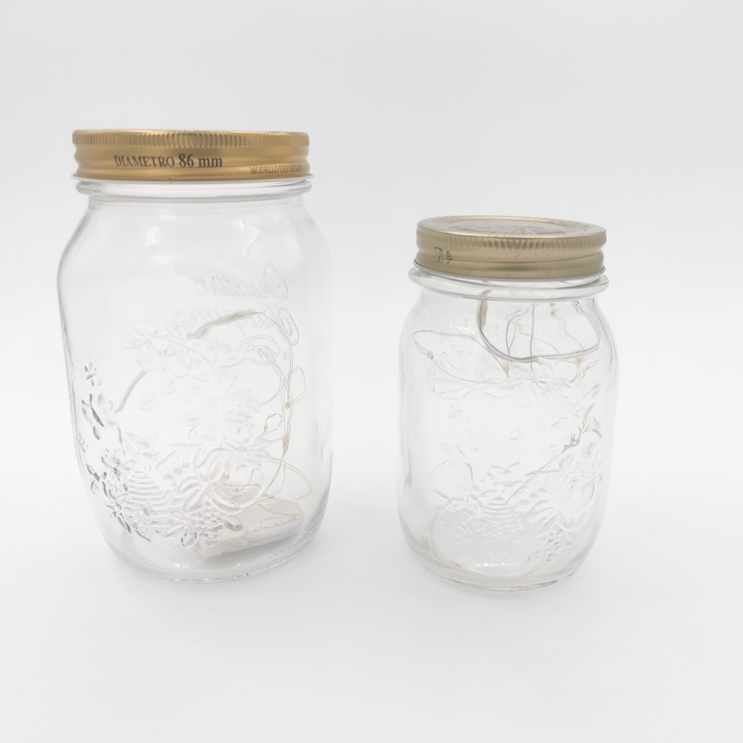 Bocal en verre avec couvercle doré Quattro Staggioni avec guirlande lumineuse fixée dans le couvercle. Chouette petite source de lumière à poser en centre de table pour apporter de la lumière ou encore dans un coin décoré de bienvenue, à l’accueil, dans des caisses à pommes ou près du livre d’or.