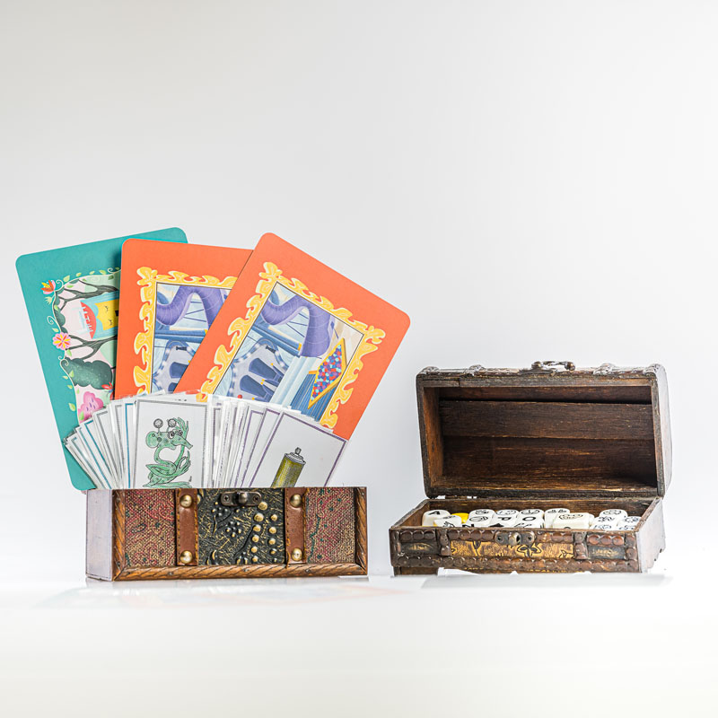 Boite en carton contenant des dés imagés et des cartes à conter pour créer ensemble de belles histoires