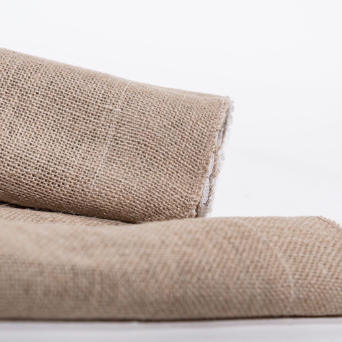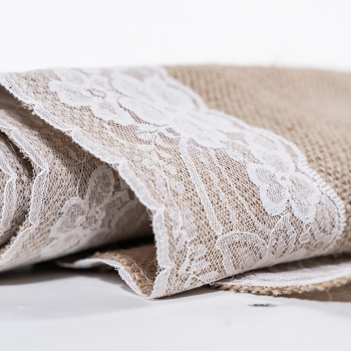 Chemin de table en jute avec brodure dentelle blanche