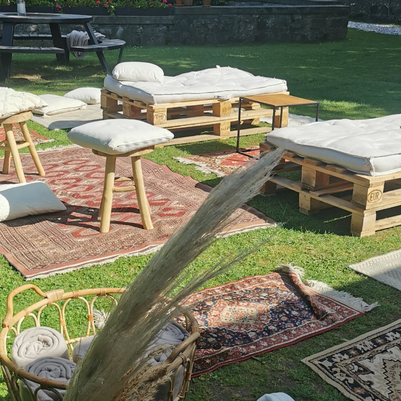 Coin lounge 2 poufs en palettes + 3 tapis + 2 coussins de sol + 4 coussins