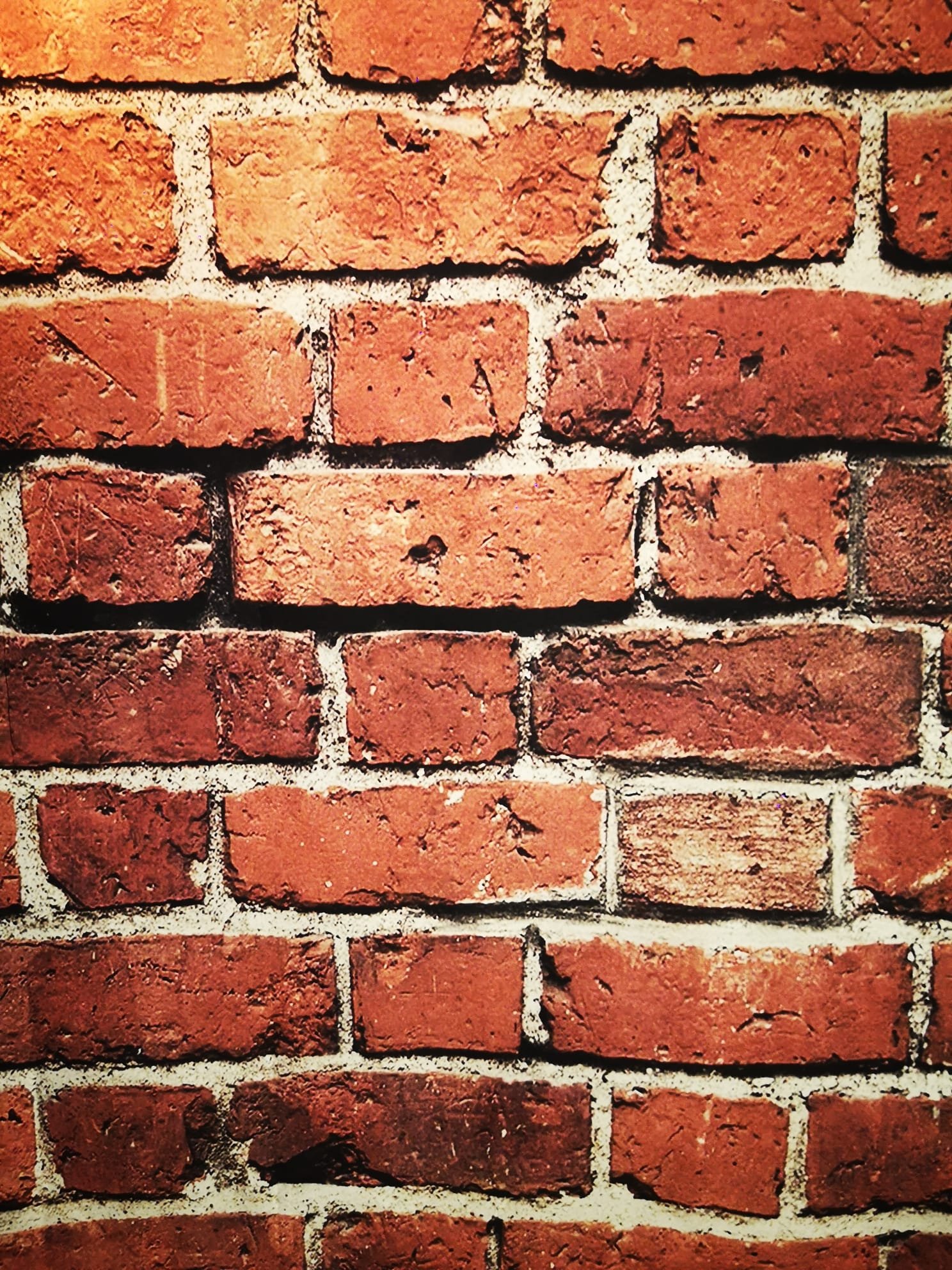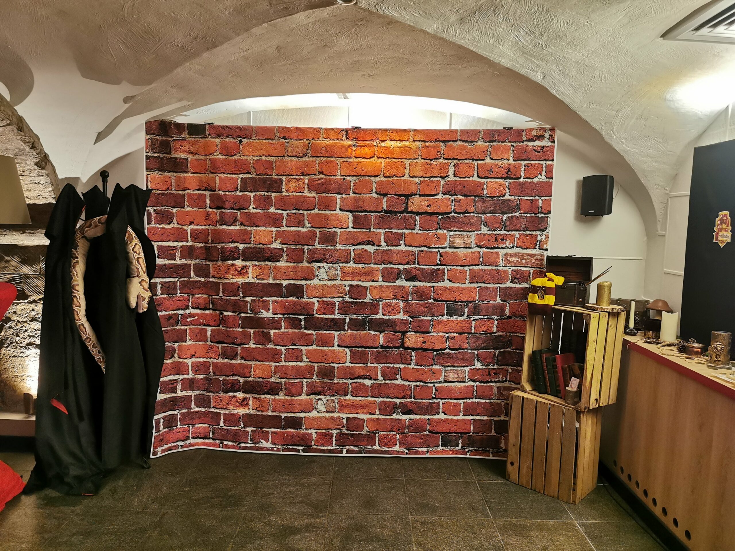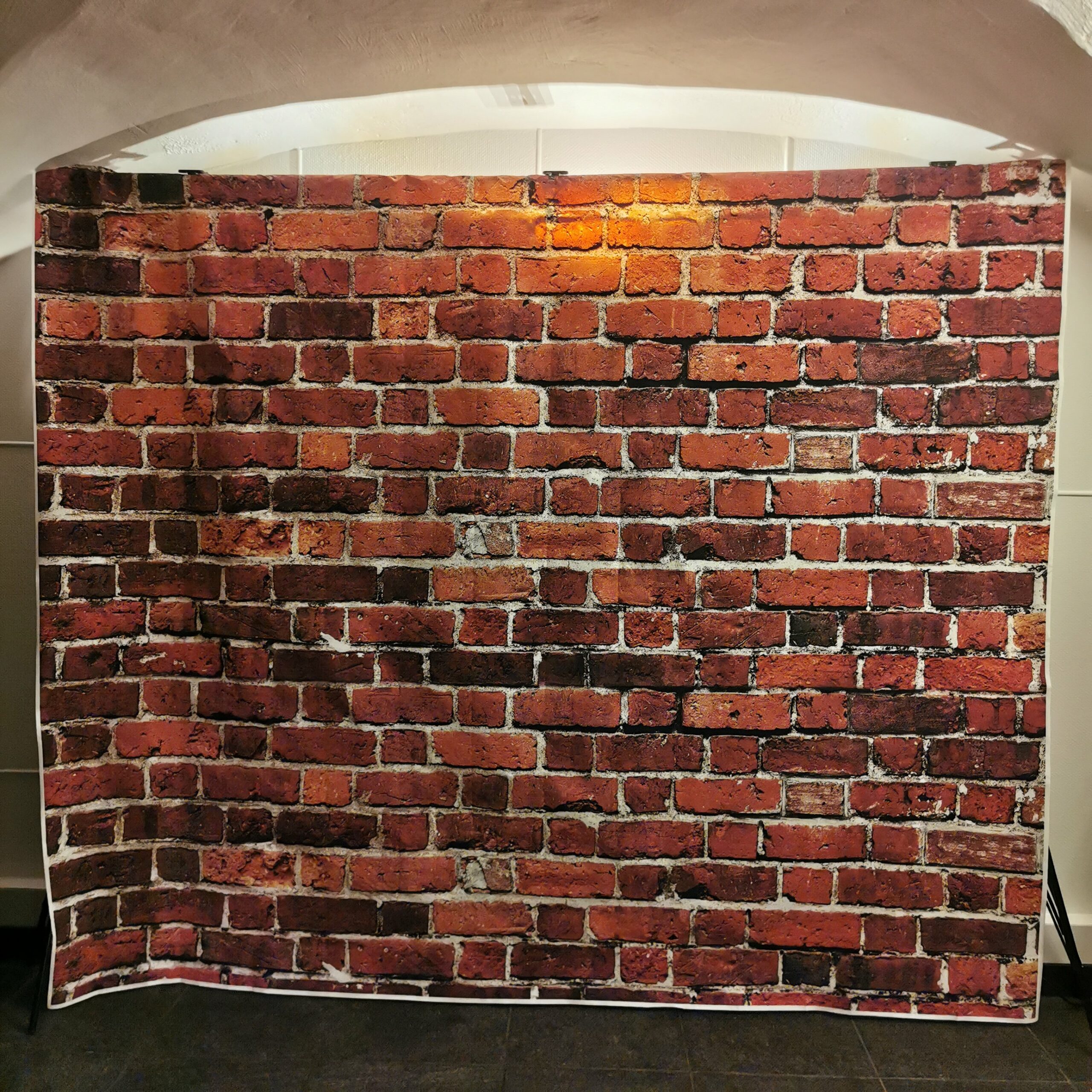 Fond en tissu effet briques réaliste, à suspendre sur le fond disponible en location.