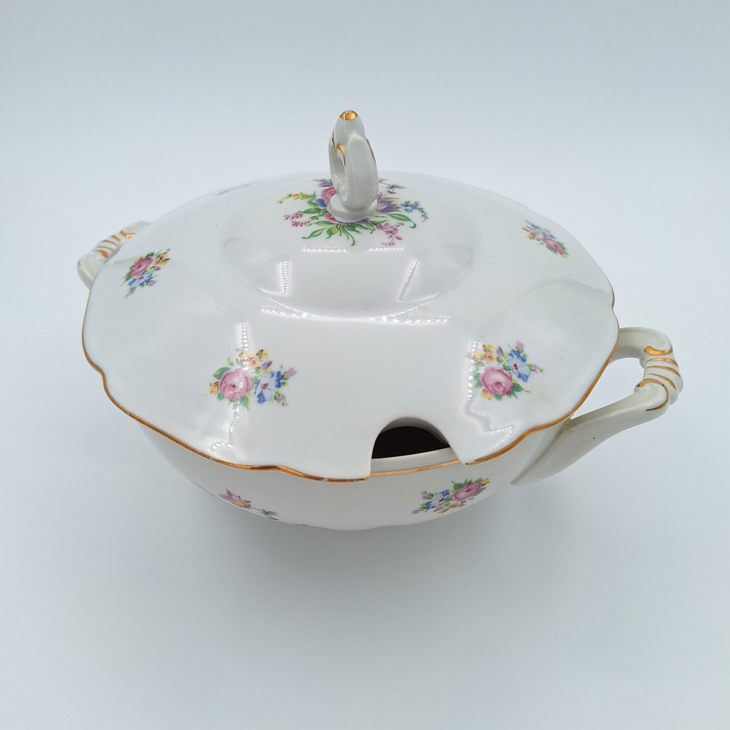Grande soupière vintage à fleurs avec bord doré (variable)