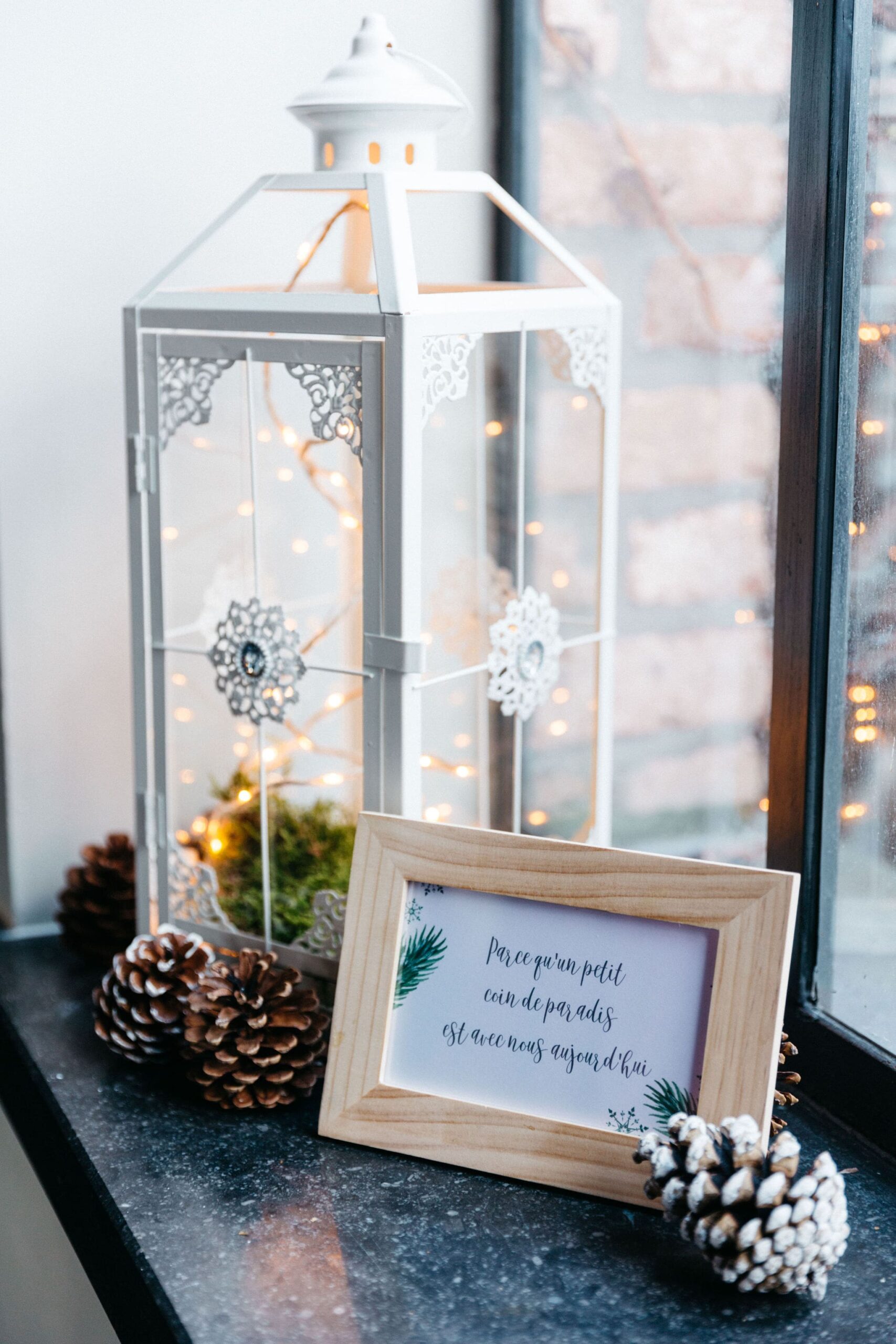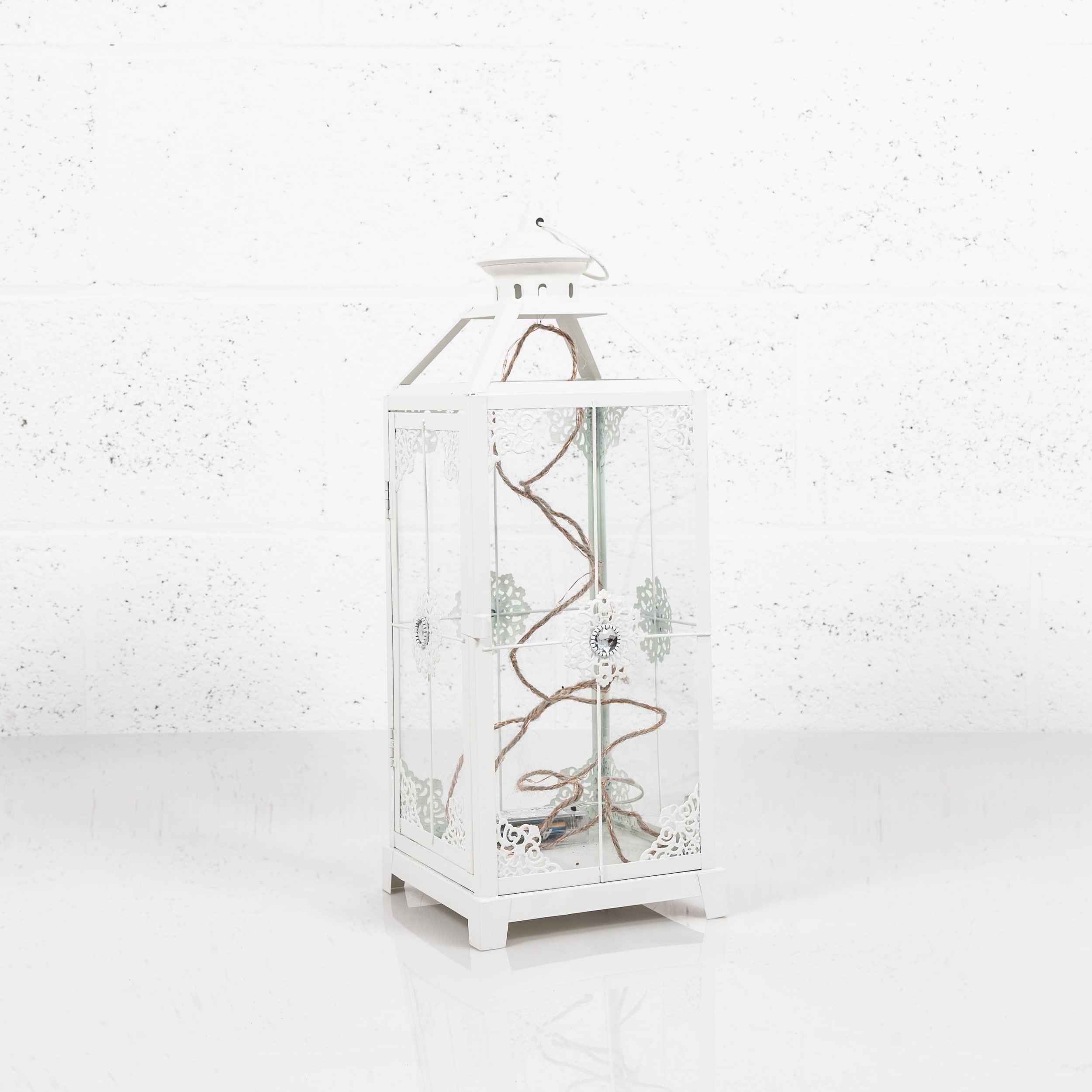 Lanterne blanche avec guirlande blanche suspendue à l'intérieur.