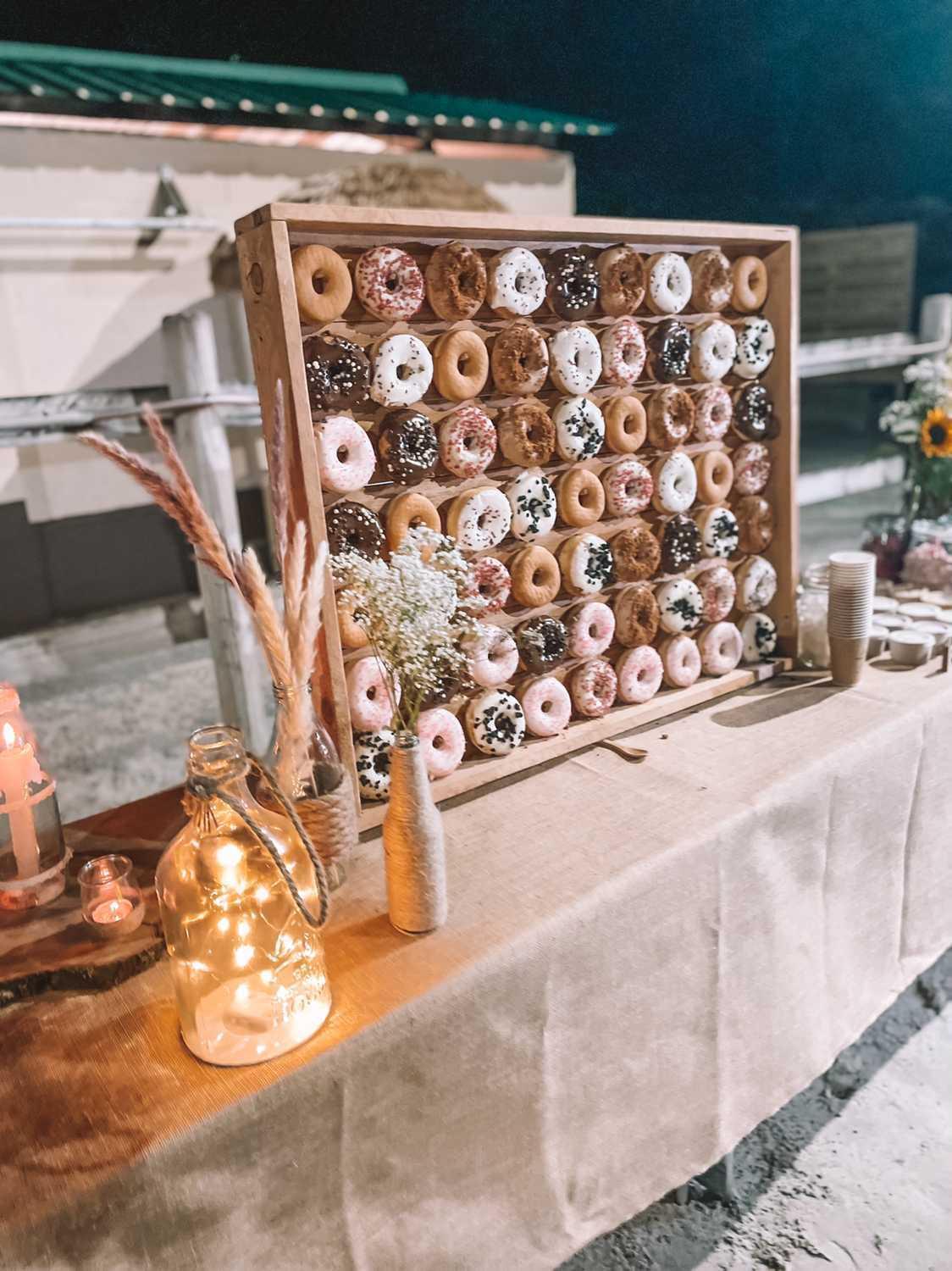 Mur en bois brut, vernis avec un vernis alimentaire. Utilisez un papier rond en fond pour éviter les tâches et faciliter la prise des donuts.