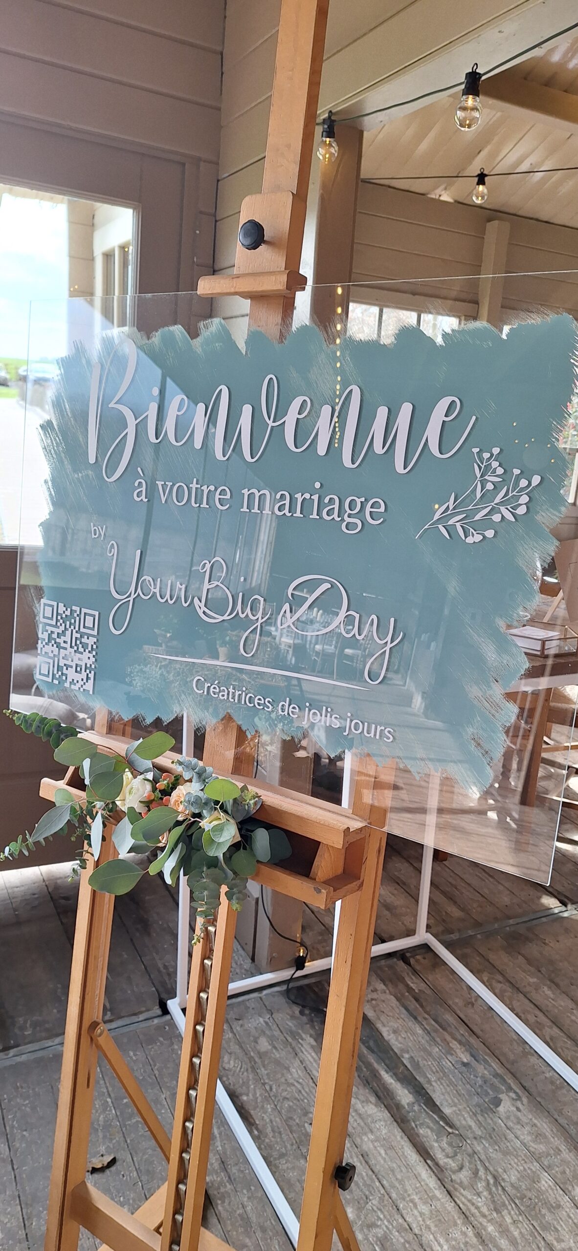 Panneau de bienvenue en plexi fond vert sauge et écritures blanches