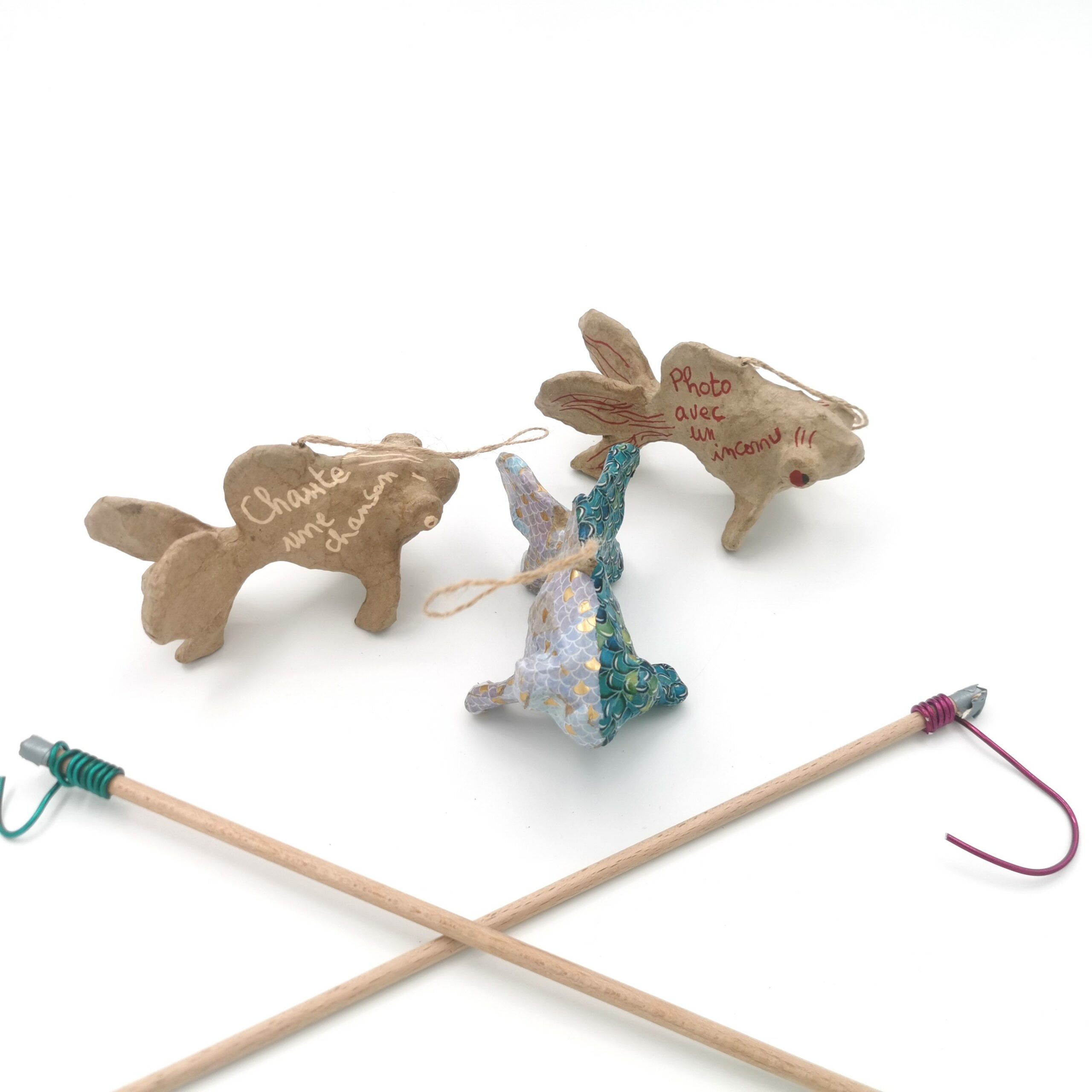 Disposez ces poissons dans une bassine en zinc garnie de copeaux (fournis), installez la fiche de jeux avec les canes à pêche et laissez vos invités s’amuser ! Les poissons en cartons sont dotés d’un gage à réaliser tandis que les poissons colorés donnent droit à un petit bonbon.